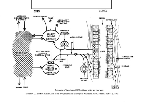 Tesla高压设备发出的离子和痕量臭氧对健康有好处,包括增强免疫系统和杀死细菌。由于具有正极性的高压设备会提供大量的负离子以及痕量的臭氧,因此图形“ 假设的神经内分泌(NEB)细胞启动的反射弧”有助于解释神经系统的益处和离子诱导的效应的途径。中枢神经系统(CNS)的反射非常广泛,其中离子传递的电子被接收到 肺部,一直到达脊髓,脑干和皮质。 臭氧的痕迹有助于血红蛋白与单个氧原子结合,从而增加氧在血液中的吸收。 根据我对EcoQuest空气净化器的经验,哮喘患者可以在附近使用微量(<0.04 ppm)臭氧发生器,使呼吸更轻松。