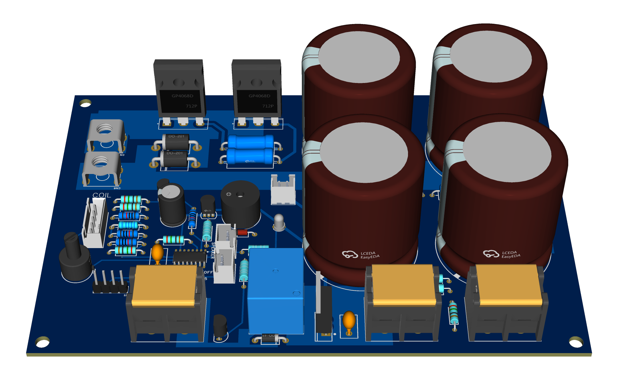 6,电路板上面的接口有:12VDC输入2P,经继电器控制后的12VDC输出2P,高压输入2P,12v散热风扇接口2P,线圈接口2P,单片机烧录口4P,基准电压接口5P
